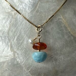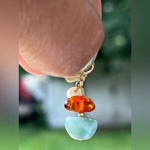 This elegant Charm features a stunning combination of amber and Larimar stones w a little white freshwater pearl. gold filled 14k With hook to add to any chain or bracelet. perfect for adding a touch of sophistication to any outfit.