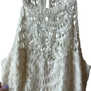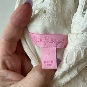 This stunning Kenna sheath dress by Lilly Pulitzer features a sleeveless halter neckline, perfect for a bride or cocktail event. Crafted in a sophisticated cream hue, the midi length and fitted silhouette offer a modern elegance. The intricate lace detailing adds a touch of timeless charm to this exquisite piece. Back zipper with eye hooks at neck. Fully lined. Color is coconut. Worn once. Excellent condition. Length from neck down is approx. 36.5”. Pit to pit is approx. 17”.