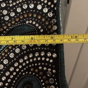 This Montana West satchel in a captivating blue hue features a stunning studded pattern that exudes elegance and sophistication. Crafted with a structured design, it offers both style and functionality, making it a perfect accessory for any occasion. The silver-toned hardware beautifully complements the intricate detailing, adding a touch of glamour to your ensemble.