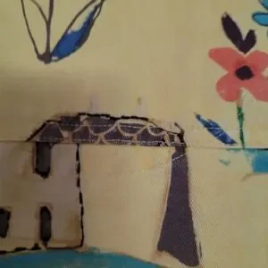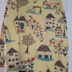 Vibrant yellow jacket with colorful floral and house design. Adds a cheerful touch to any outfit.
