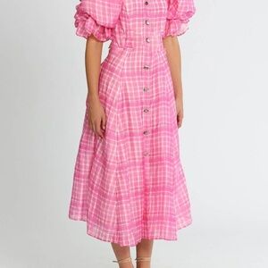 This charming sundress by Aje features a vibrant pink and white gingham pattern, perfect for casual or resort wear. The dress boasts a flattering square neckline and short puff sleeves, adding a touch of romance. Its midi-length pleated skirt offers a classic and breezy silhouette, ideal for sunny days.