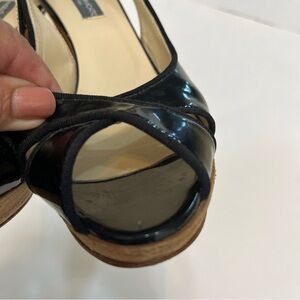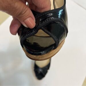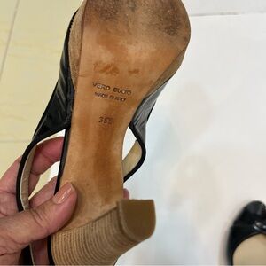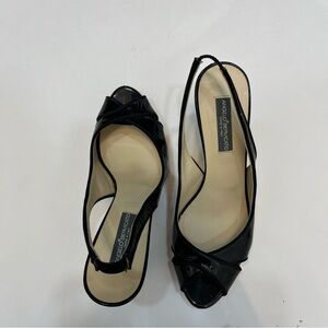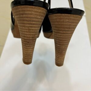 Chic black peep-toe heels with a stylish tan heel. Perfect for adding elegance to any outfit.