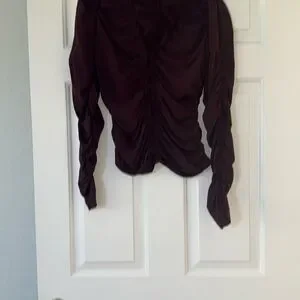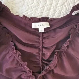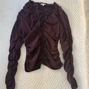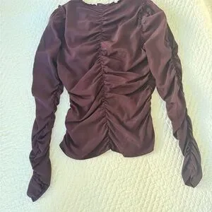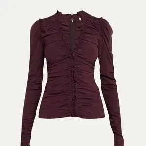 This A.L.C. blouse features a striking maroon hue with a ruched design that adds texture and sophistication. The puff sleeves and mandarin collar enhance its elegant silhouette, making it a standout piece for any occasion.