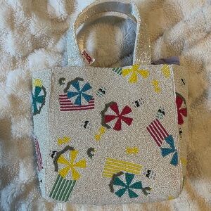 NWT viral TikTok beaded bag from Made in India that has fun towels and umbrellas at the beach. Mini tote bag.