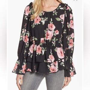 Halogen Navy Floral Peplum Blouse with Bell Sleeves