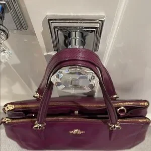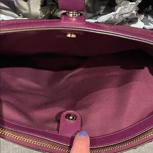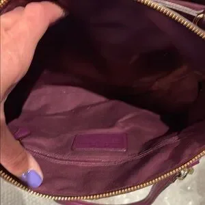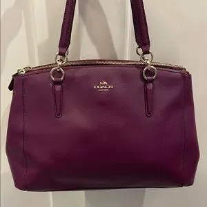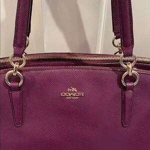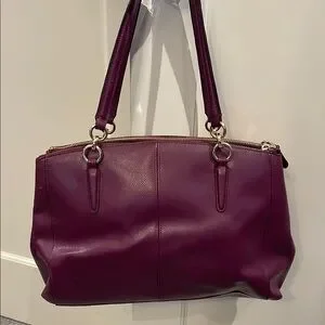 This sophisticated Coach shoulder bag in a rich purple hue is crafted from smooth leather, featuring a structured design with rounded edges and silver-tone hardware. Its elegant appearance makes it a versatile choice for everyday use, combining luxury with practicality.