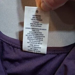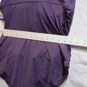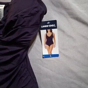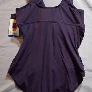 Cute dark purple one piece swimsuit. New with tags, still has hygienic liner. Front is ruched, has removable cups. Size large.