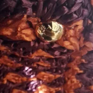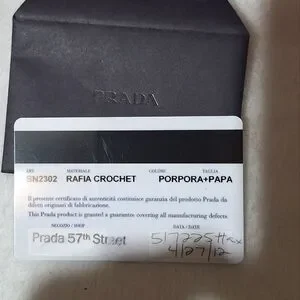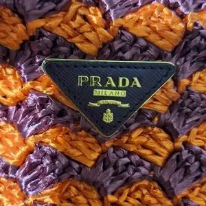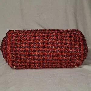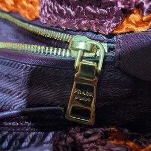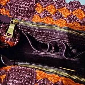 Elegant Prada bag with a unique crochet design. Features a rich purple/deep burgundy and vibrant orange pattern. Perfect for stylish outings.