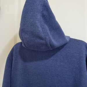 Carhartt Heather Midweight Logo Hoodie Sweatshirt, color Blue Heather. Item reference K288 H53. Long sleeves, adjustable drawstring hood, kangaroo pocket, ribbed hem and cuffs, inner fleece, loose fit. No stains or holes; pilling is light to moderate depending of the area.