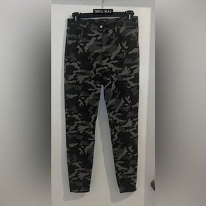 These Fashion Nova skinny pants showcase a sleek black and gray camouflage pattern, offering a modern and stylish look. The fitted design with a tapered leg ensures a contemporary fit, perfect for any casual occasion. The monochromatic color scheme adds versatility and a chic edge to your wardrobe.