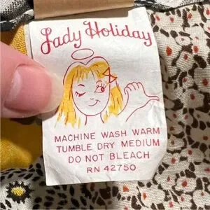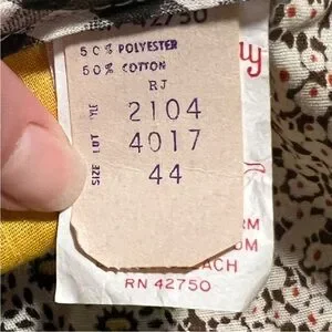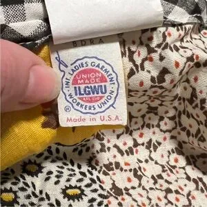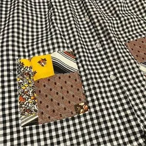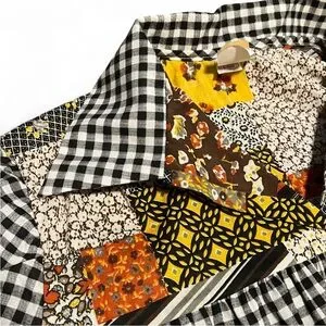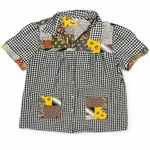 Step into unique vintage style with this charming "Lady Holiday" button-up shirt! This eye-catching piece features a classic black and white gingham check pattern adorned with an incredible array of colorful patchwork details on the collar, short sleeves, and two front pockets. The patches showcase various patterns, including florals and abstract designs, in shades of yellow, brown, orange, and white, creating a truly one-of-a-kind look. Made from a comfortable and easy-care blend of 50% polyester and 50% cotton, this shirt is perfect for adding a playful and artistic touch to your wardrobe. It was proudly Made in U.S.A. with the ILGWU union label, signifying quality craftsmanship.