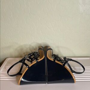 Elegant BCBGirls slingback wedge heels with black straps and Tan accents add a stylish touch. Perfect for any outing. Size 7.5B. Heels 4”. Scratch on front of left shoe. Very good condition.