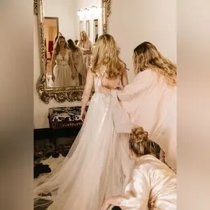 The lace appliques cascade down the bodice and onto the skirt, creating a breathtaking effect. The soft tulle skirt flows gracefully, allowing for easy movement and ensuring that you feel comfortable throughout your special day. The train adds a touch of drama, making you feel like a true princess as you walk down the aisle.