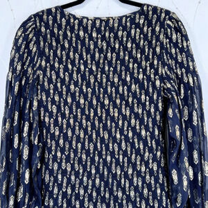Silk blend. Main color is an extremely dark navy, almost Hand wash cold. Partially lined. Smocked fabric - SUPER stretchy. Metallic thread accents. Ruffle hem.
