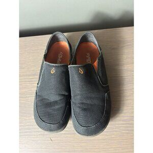 This is a pair of OluKai Boys' Slip-On shoes in a dark shadow/Blaze color. The shoes are a size 5 and feature a mesh fabric type. They are designed for casual wear and are ideal for walking, going to the beach, or wearing to school. The slip-on style provides easy on/off convenience for young boys.