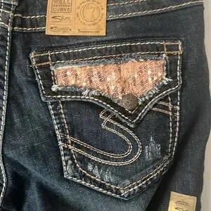 New with tags Silver Jeans Co. Suki Super Stretch Mid Rise Boot Cut Sequin Back Pocket Flap Distressed Denim Jeans