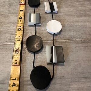 Inspired by the 20th century art and architecture movement of the same name, this necklace is an ode to craftsmanship, modernism, primary colors, and experimentation with space and form. Handmade Eco-Resin slices with marbled color accents on a long adjustable sculptural Necklace.