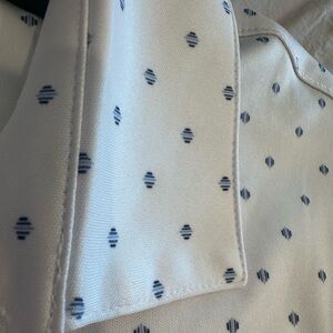 Elevate your style with this classic Greg Norman white with blue designs polo-shirt. Perfect for any occasion, it offers a comfortable fit and timeless design. Has design slits on both sides.
