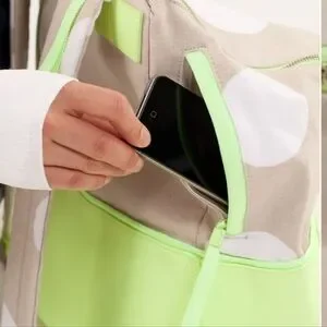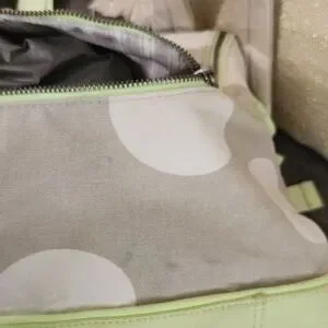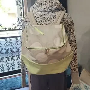 Stylish and functional, this polka dot backpack features a vibrant neon green and beige design. Perfect for everyday use, it combines fashion with practicality. Some faint stains and marks throughout, not very significant.