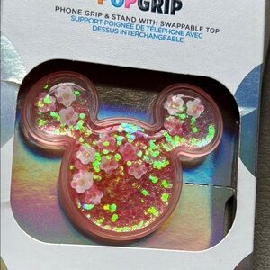 This is a new sparkling glittery pink and peach flowery Disney Mickey Mouse PopGrip Popsocket. Ideal for secure phone grip and stand. The popsocket has liquid and the glitter and flowers move.