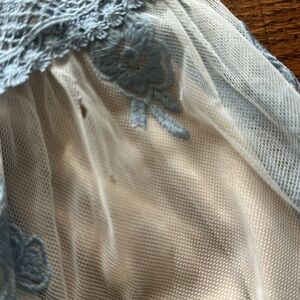 This elegant women's dress features a beautiful blue floral pattern on a cream background. Both are new with tags, but the skirt has three very small holes at the bottom on the skirt (in photos). Never worn. Top is size small, skirt is M but the waist is only 13”.