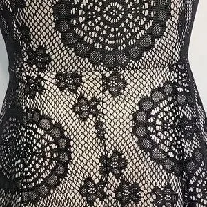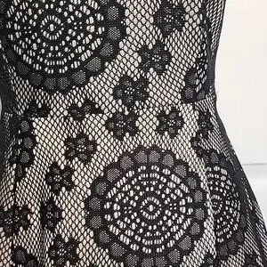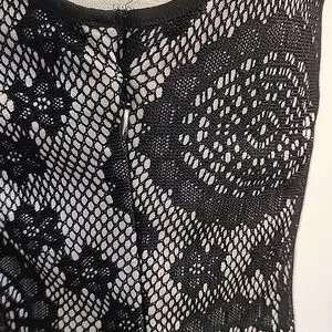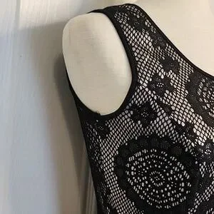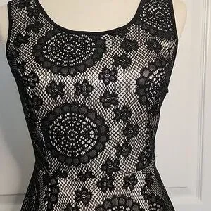 Super cute woman's dress, beautiful embroidery type fabric, side zipper, sleeveless, scoop collar, see through fabric on the back. fully lined witha neutral color fabric.