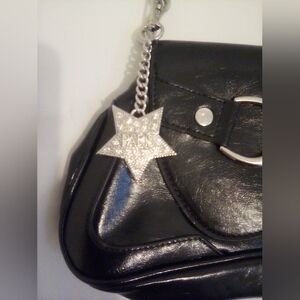 Exterior details: High gloss faux leather, silver - tone metal hardware; dangle chain with star charm.