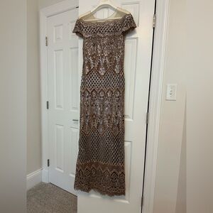 Stunning long gown with intricate overlay pattern. Taupe, blue, silver colors blend and sparkle as you move. Worn once. I would wear it to every wedding if I could get away with it!