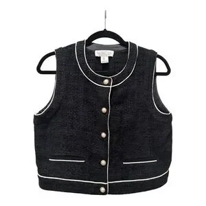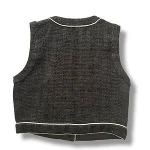 Chic black vest with white piping. Features a pearl button accent.