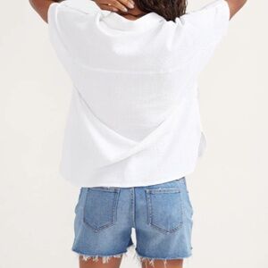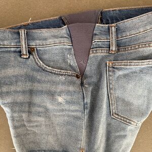 Pre-owned HATCH "The Cut Off Denim Maternity Shorts". Great condition! Just the right amount of distressing for that had-forever feel and a stacked hem (shorter in the front and longer in the back) for extra coverage. HATCH finished these perfectly slouchy shorts with our signature grow-with-you bamboo/spandex wedge, custom buttons and rivets, and pink HATCH stitching at the belt loop.
