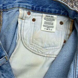 Stylish light blue jean shorts by Agolde. Features a distressed design with frayed hems. Perfect for casual wear.