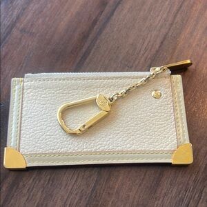 Elegant cream leather with gold accents. Features a secure zipper and keychain clip. Perfect for essentials.