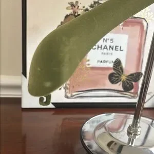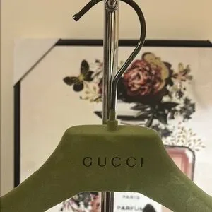 Luxurious Gucci hanger in olive velvet. Ideal for showcasing designer apparel.