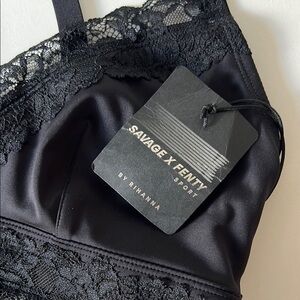 Savage x Fenty low impact lace race sports bra. Size large. Features low impact, V neckline, lace trim, darts at bust, fully lined power mesh layer, plush back elastic underband, elastic straps, adjustable straps. New with tags. Never been worn.