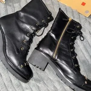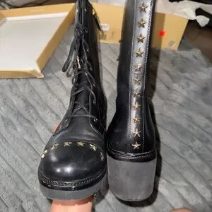Stylish black combat boots. Gold star accents on toe. Lace-up design. Durable sole.