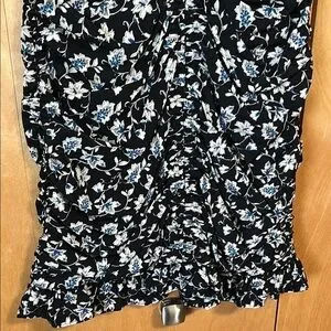 This elegant mini dress by Veronica Beard showcases a stunning floral pattern in blue and white on a black backdrop. Designed with a V-neckline and short sleeves, it offers a chic and comfortable fit perfect for cocktail events.