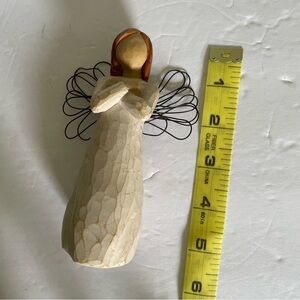Elegant Willow Tree angel with a heartwarming pose. Features cream and tan hues. Ideal for home decor. Hand painted red hair to accentuate. Measurements in photos.