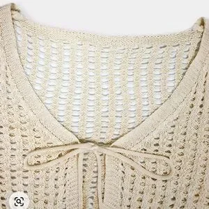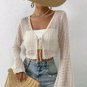 Women's Plain Hollow Out Tie Front Crop Cardigan, Casual Flounce Sleeve V Neck Cover Up Knitwear. perfect for sundress or over a tank top