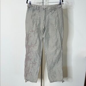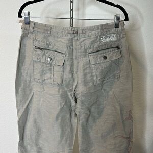 VGUC size S. Color is tan. Button/zip closure, belt loops, adjustable waist straps, zippered hand pockets, snap closure back pockets with decorative zipper detail, sewn on decorative embellishment on leg, hem with drawstring. Approximate measurements: waist-15”, rise-9”, inseam-31”. JP-10