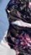 Elegant satin romper with a vibrant floral pattern. Features shades of pink and purple on a black background.