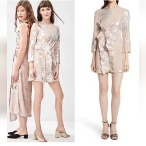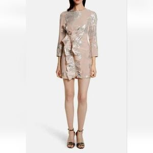 Pinkish nude metallic Fil Coupe ruffle mini dress. It is pink silk with silver metallic leaf print and the lining is a nude. Hidden back zipper and a functional zipper along the ruffle in the front. Pit to pit is approximately 15.5" and length is 32". Gently worn.