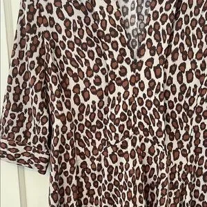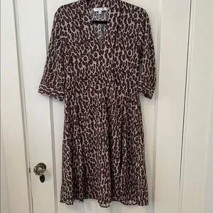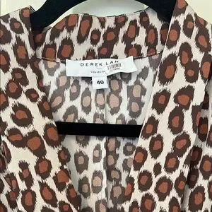 This elegant sundress by Derek Lam features a striking brown and black pattern, perfect for casual or work settings. The dress boasts a V-neckline and 3/4 cuffed sleeves, offering a sophisticated yet relaxed look. Its notched collar adds a touch of refinement to this versatile piece.
