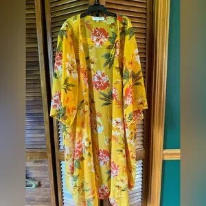 Vibrant yellow kimono with floral print. Features red and white flowers. Lightweight and flowy design.