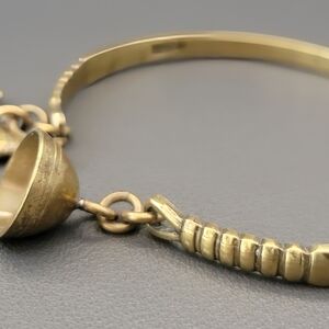 This rare vintage brass bangle by Kalevala Koru—Finland’s beloved heritage jewelry house—blends mythology and craftsmanship into a wearable tale. Two symbolic charms grace the piece: a stylized bird and a soft-ringing bell, both steeped in Finnish folklore.