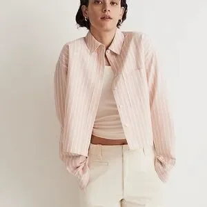 Stylish pink striped button down *oversized crop* shirt. Features classic collar and button closure. Perfect for casual or formal wear.
