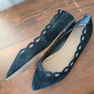 Pretty flats showcase a sophisticated scalloped design along the edges, crafted in sleek black suede. The pointed toe and streamlined silhouette offer a touch of elegance, making them a versatile choice for any occasion. Excellent condition.