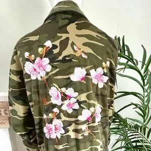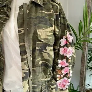 Chic jacket featuring camouflage pattern and floral embroidery. Zip front and snap front closure. 4 front pockets, cinch waist treatment.