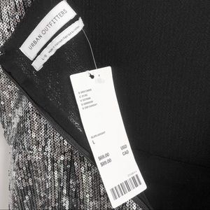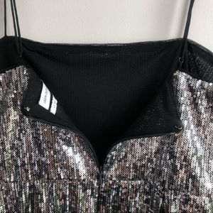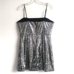 Silver spaghetti strap dress by Urban Outfitters. Shimmer and shine in all-over-sequins. Adjustable straps, seamless back zipper opening, black mesh lining.