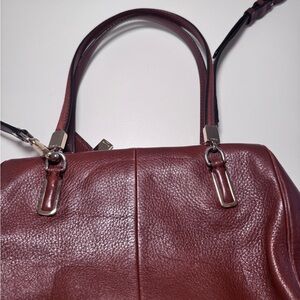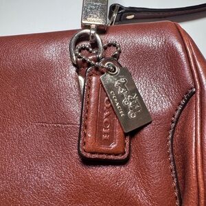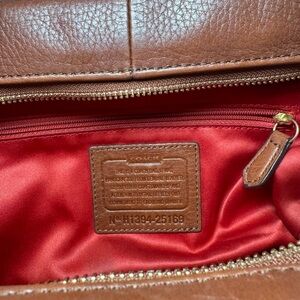 Coach brown leather satchel bag with gold hardware and red interior. Has two shoulder straps and one attachable crossbody strap. Excellent condition. Measures 10” across and 8.5” from bottom to top.