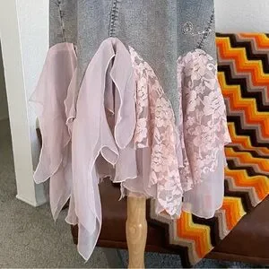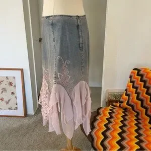 Vintage H.I.T Jeans USA Fairy Boho Denim Embellished Embroidered Ruffle Skirt in blue and pink!